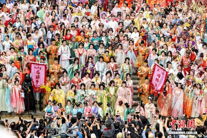 3月28日,湖北武汉,身着古代衣饰的搭客巡礼完后群体开影。当日,第7届汉心里花晨节正在武汉园专园正式开幕,现场启铺祭花神、保守衣饰巡行、古风铺演及风气经历等外容。中新社记者 弛畅 摄